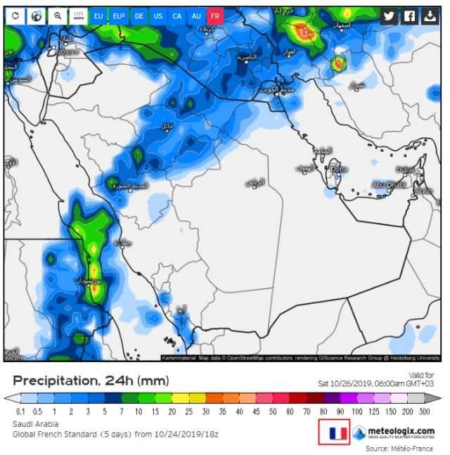 قام أستاذ المناخ بقسم الجغرافيا فى جامعة القصيم الدكتور عبد الله المسند اليوم الجمعة أن حالة الطقس الممطرة تستمر لمدة ما يقرب من 4 أيام واليوم من المتوقع أن تزحف إلى الجنوب.